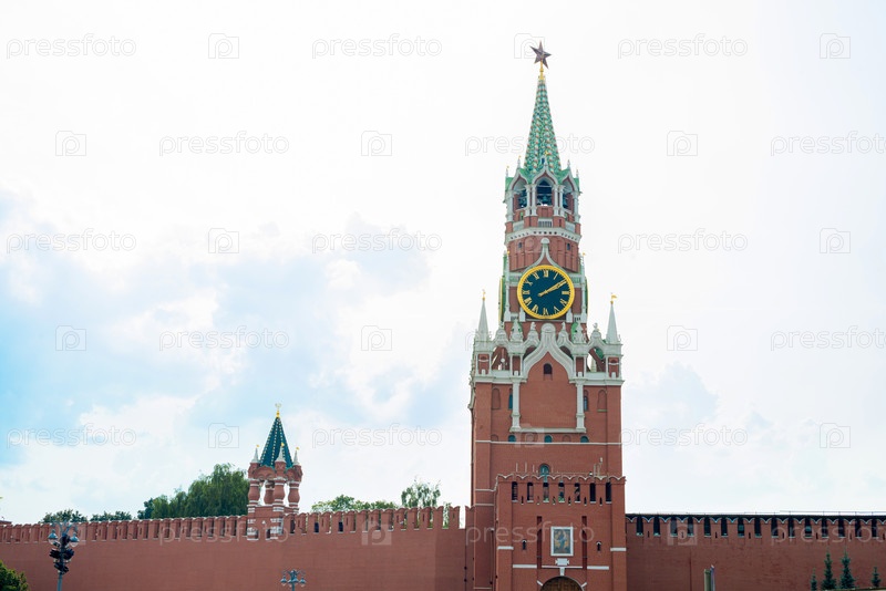 Спасская башня Московского Кремля с часами на фоне облачного неба. Видны золотые купола храмов и часть кремлевской стены