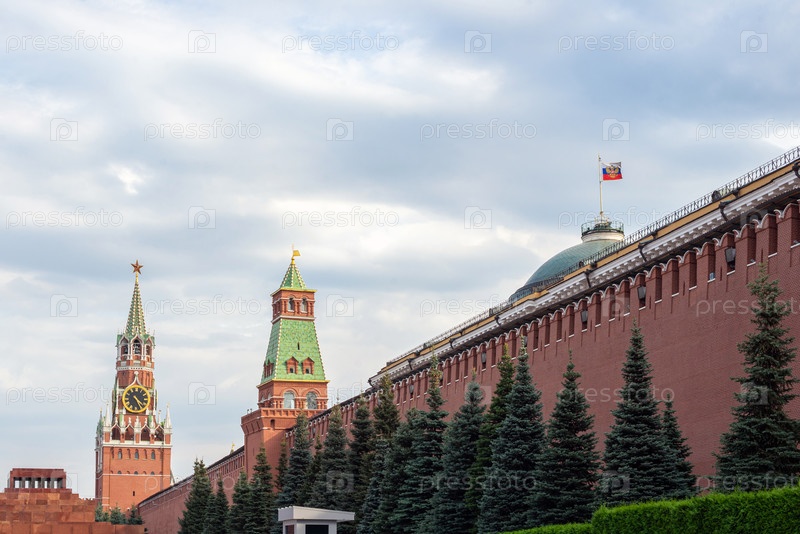 Красная площадь, Москва. Слева видна Спасская башня Кремля с часами и Мавзолей, в центре - Сенатская башня и часть кремлевской стены с зубцами