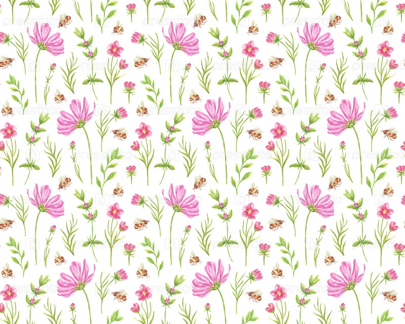 Летний бесшовный рисунок с акварелью розовых цветов, трав и шмелей