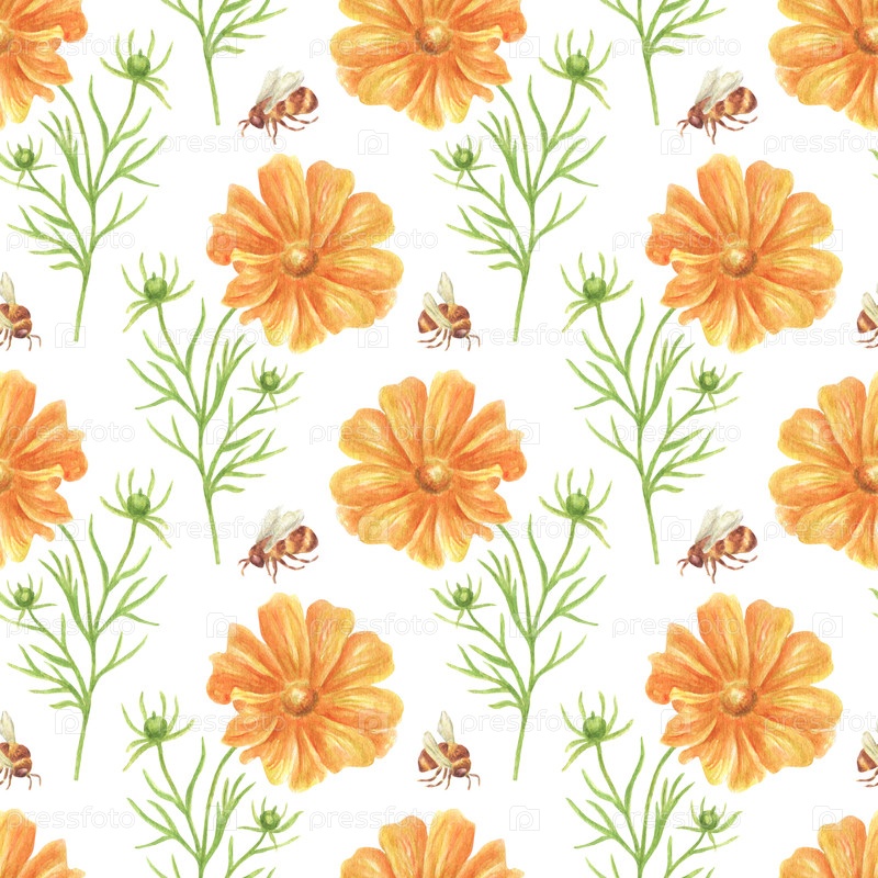Акварельный бесшовный рисунок с летними цветами и пчелами.Красоватый ботанический принт, нарисованный вручную