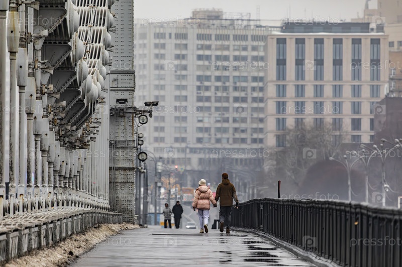 Пара гуляет по пешеходной дорожке большого металлического моста в пасмурный день