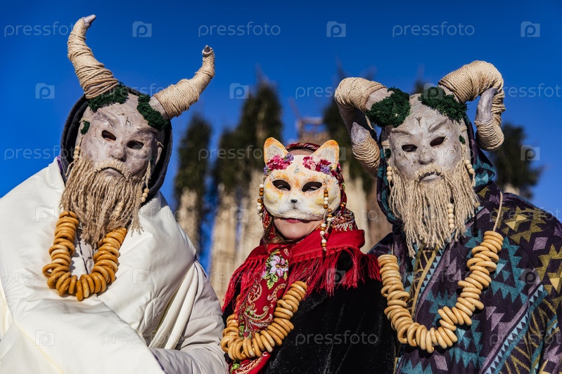 Участники народного карнавала в масках с рогами и ожерельями из баранок, Никола-Ленивец, 2026