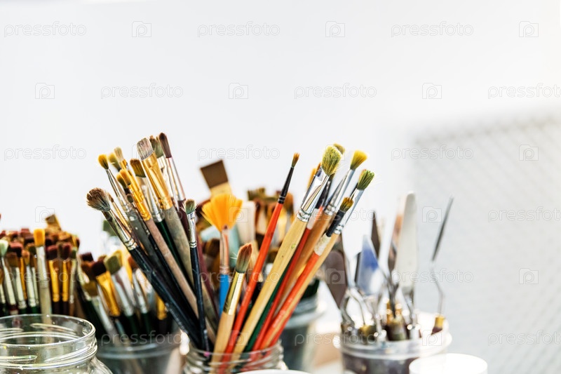 Коллекция художественных кистей и ножей палитры в стеклянных бочках. Инструменты художника для масляной и акриловой живописи на холсте. Творческое семинарное оборудование для художников, любителей и студентов