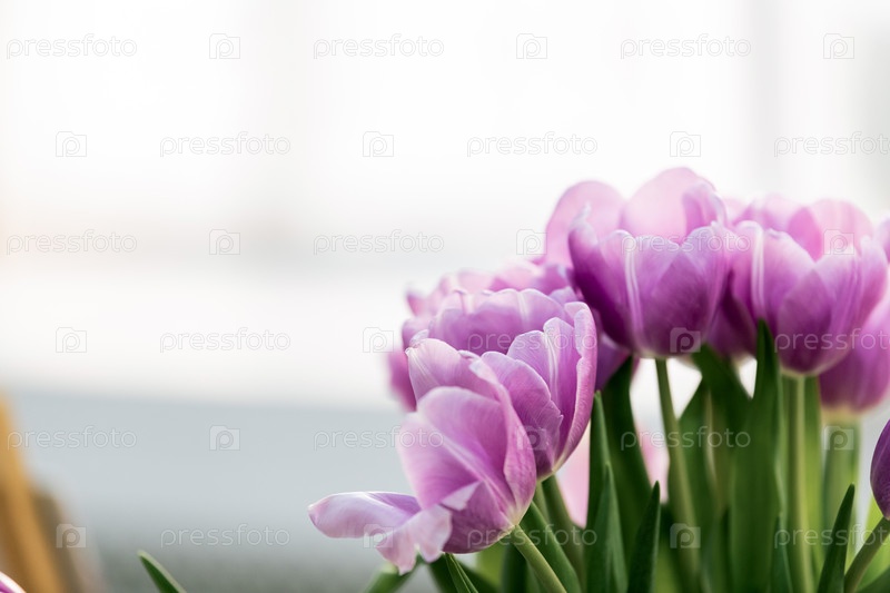 Букет фиолетовых тюльпанов в вазе возле окна.Весенняя цветовая аранжировка во внутреннем интерьере дома. Свежее цветочное украшение для поздравительной открытки, праздничного торжества или концепции дизайна фона