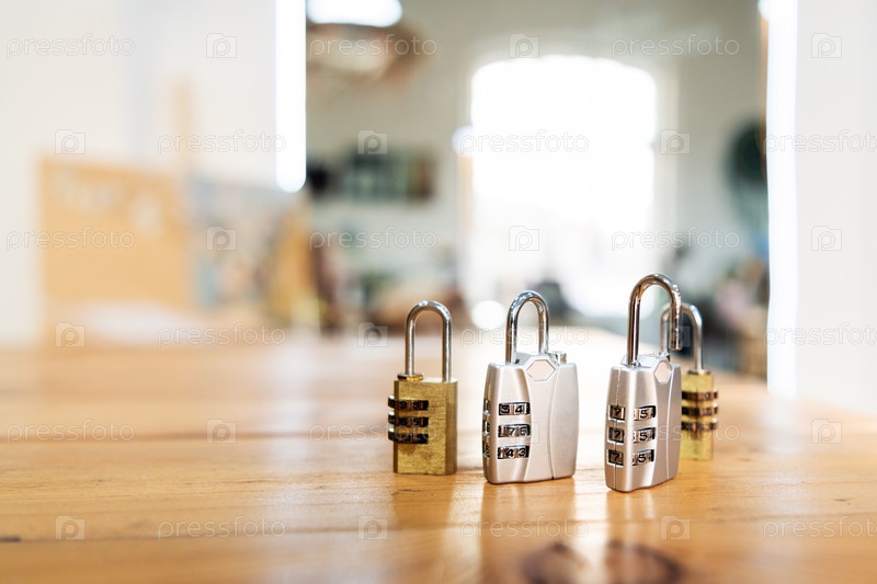 Комбинированные замки стоящие на деревянном столе. Концепция безопасности и защиты. Металлические замки с цифровым кодом для охраны частной собственности, безопасность и решения конфиденциальности данных