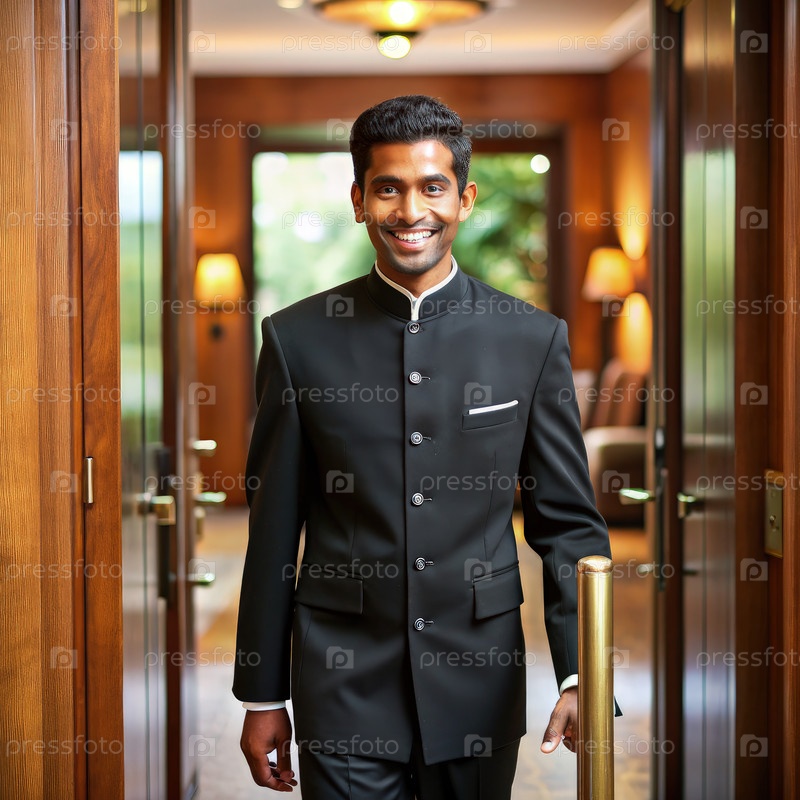 Улыбающийся маврикийский парковщик в лобби четырехзвездочного отеля. Генеративный ИИ