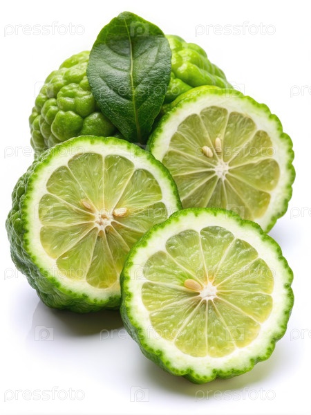 Близость сочных нарезанных плодов бергамот с зеленым листом на белом фоне