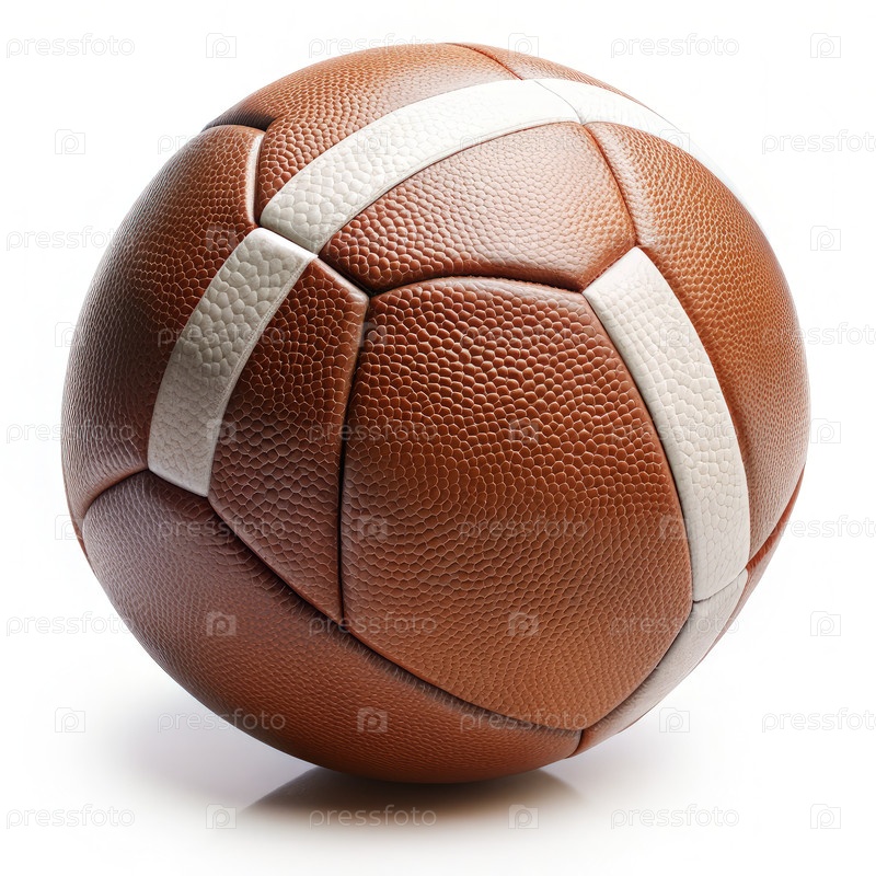 Ближайшее изображение коричнево-белого футбольного мяча на белом фоне