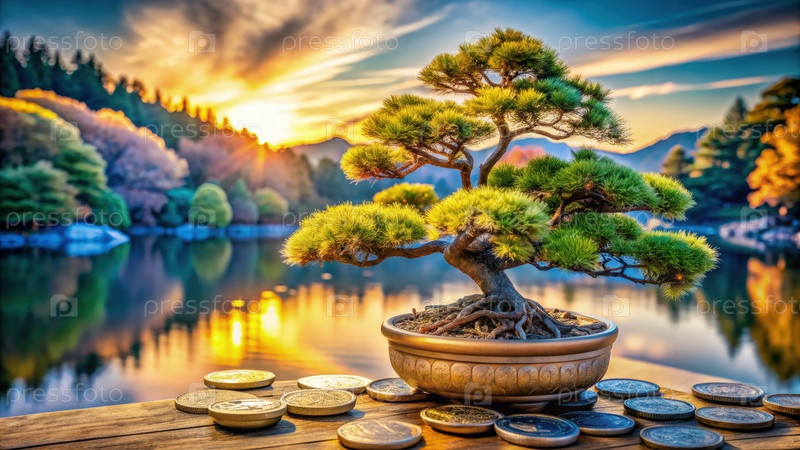 Японское дерево бонсай на закате с монетами для хорошей удачи