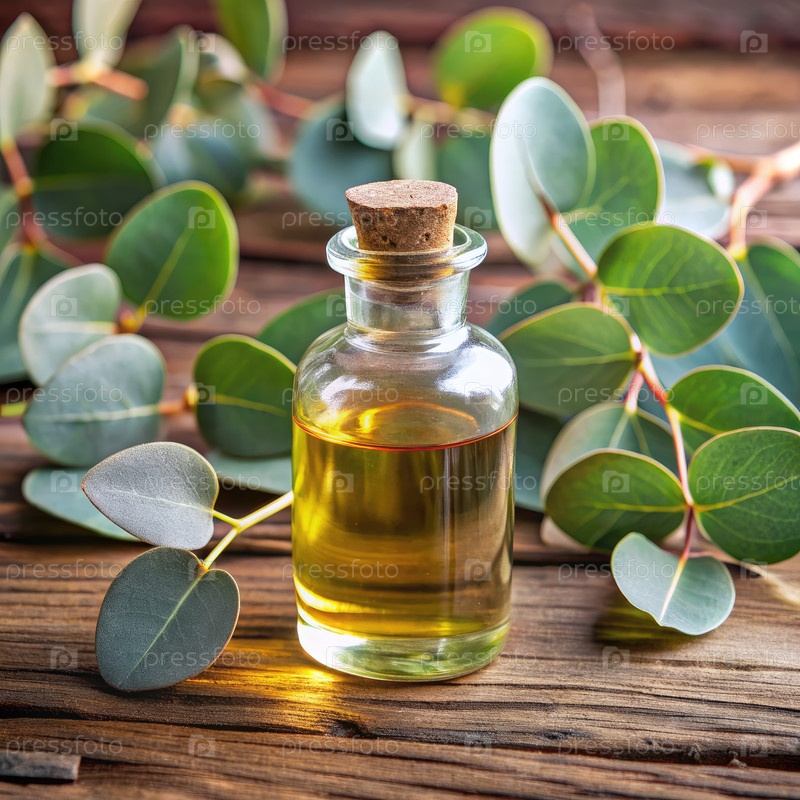Бутылка эвкалиптового масла, окруженная свежими зелеными листьями эвкалипта на деревянном столе