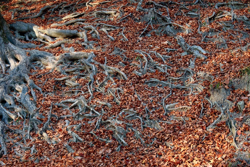 Гнутые корни деревьев простираются по влажному грунту среди запыленной коры и рассеянного листва