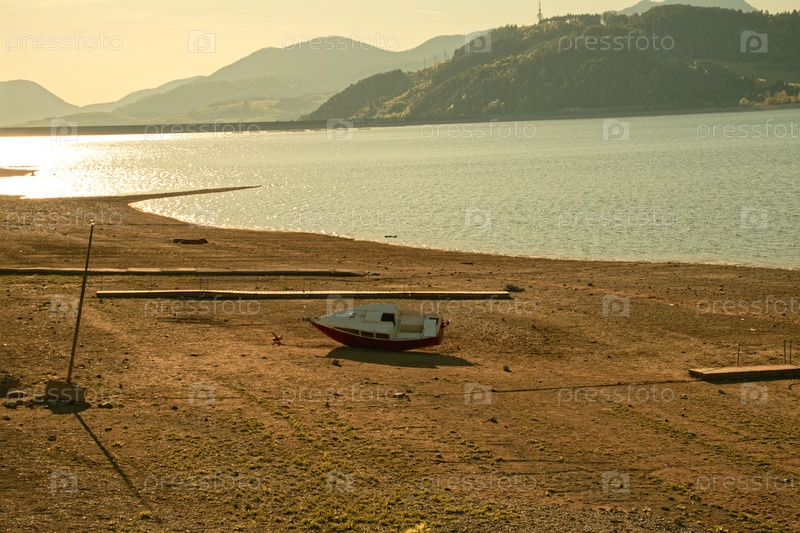 Спокойный берег озера с ярким закатом солнца отражает на влажном песке