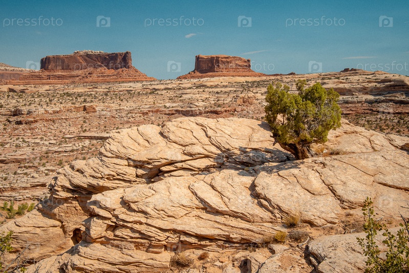 Сухой песчаник с одиноким деревом среди многослойных скал и обширного неба