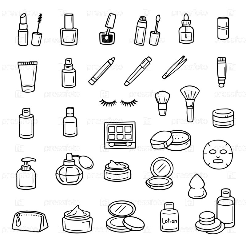 Макияж красоты Doodle ручной рисунок знаковый набор. Контурные чертежи косметики линия клип-арт символ. Векторная иллюстрация