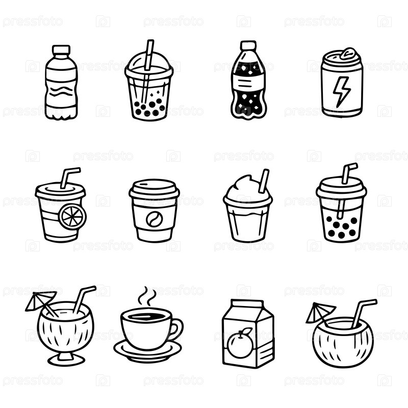 Коллекция рисованных вручную икон, изображающих различные горячие и холодные напитки, включая кофе, чай, соки и газировку, подаваемые в разных чашках, стаканах и контейнерах