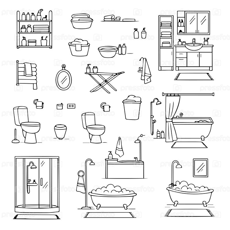 Ванная комната интерьер изолированные элементы дизайна. Векторный рисунок с иллюстрацией, нарисованной вручную. Аксессуары для ванны и душа и комплект оборудования. Банка со пеной, шампунем, зеркалом, сушилкой полотенца