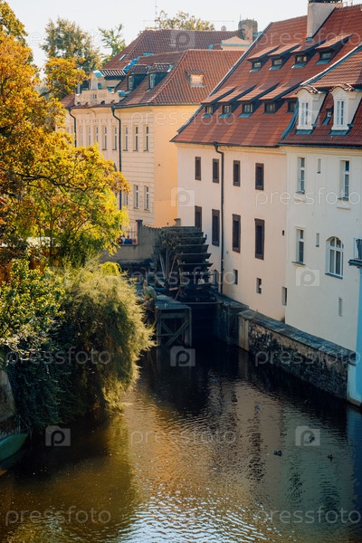 Спокойный городской водный путь с золотыми деревьями и историческими фасадами поблизости