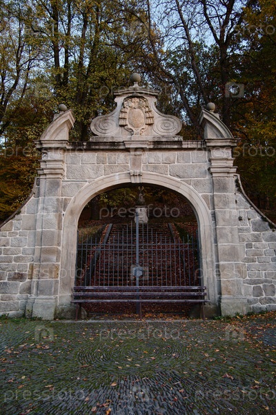 Дверь из старого камня и кованого железа расположена среди процветающей зелени и разбросанных осенних листьев
