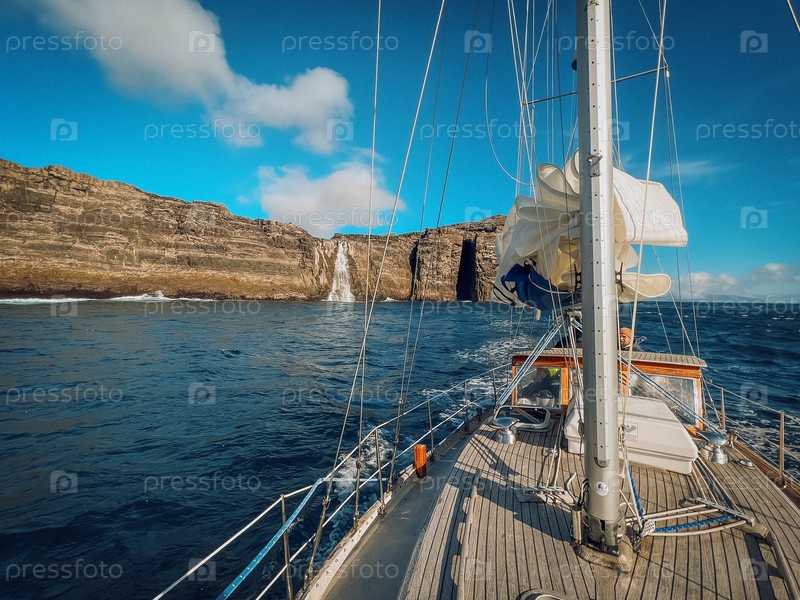 Парусная лодка продвигается по бурным морям к прочным берегам и водопадам