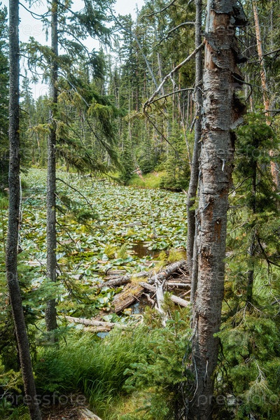 Тихий лесный пруд, окруженный высокими еловыми деревьями и пышным мохом