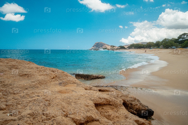 Спокойная прибрежная сцена для отдыха. Идиллическое пляжное убежище с скалистыми окрестностями и чистым небом