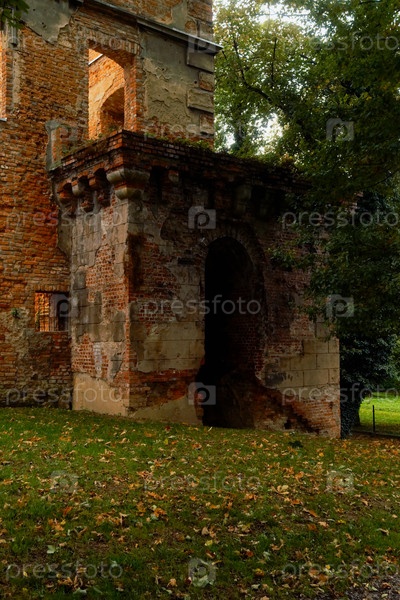 Идиллический вид на сельскую местность, демонстрирующий мокрый дверной проем в окружении осенних листьев и нежного солнечного света