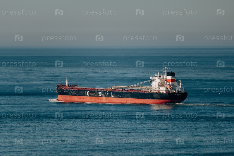 Большое грузовое судно, неуклонно перемещающееся по спокойным водам, символизирующее всемирную логистику и судоходные операции