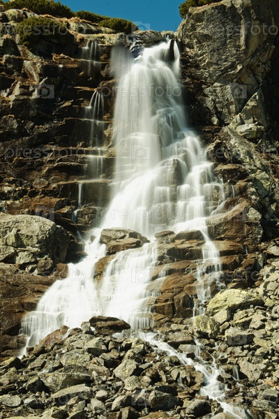 Мощный альпийский водопад над мелкими скалами среди спокойного ландшафта горных районов и чистого голубого неба