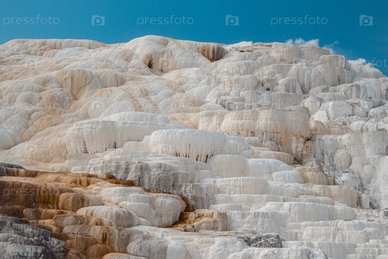 Потрясающие слоистые кальцитовые террасы в горячих источниках Мамонта с чистыми белыми поверхностями и спокойной атмосферой