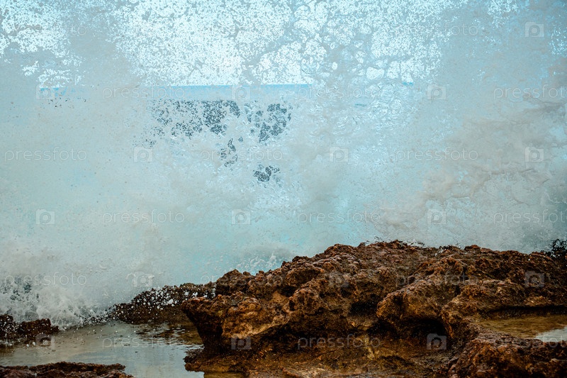 Удаленная береговая линия, отображающая бурный серф и текстурированные геологические образования под облачным небом