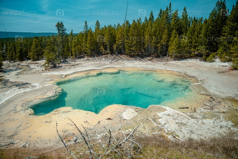 Красочная природная сцена горячих источников, живописный геотермальный колодец с яркими цветами и текстурированными краями