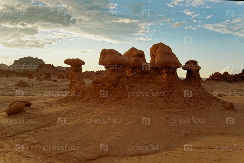 Каменные образования, напоминающие грибы, расположены под чистым голубым небом