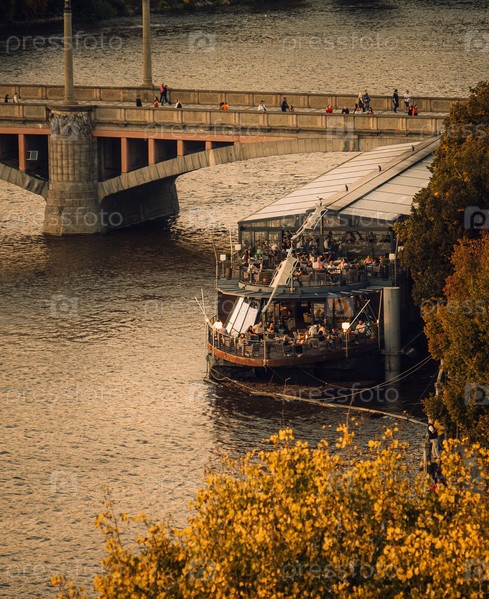 Спокойная вечерняя закатная сцена с посетителями на набережной под вечными каменными арками