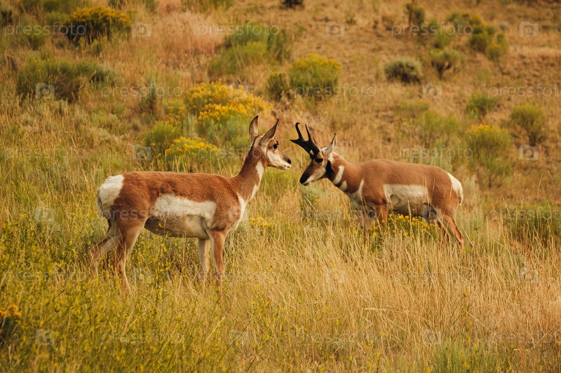 Осенняя Прерия проводит свирепую мужскую дуэль.Два пронгхорна сражаются во время сезонной войны на открытых равнинах