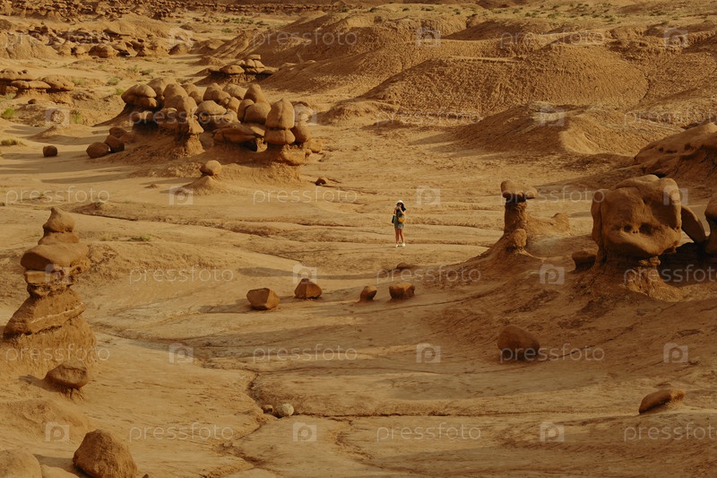 Одинокий странник среди возвышающихся скал.Одинокий авантюрист, наблюдающий за обширными песчаниками