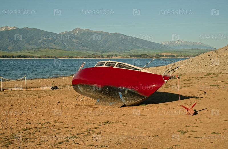 Строгий взгляд на старую красную лодку в песке Showing Details
