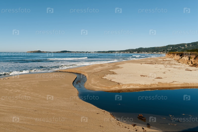 Красивое побережье с ручьями и скалами, спокойная калифорнийская береговая линия с нежными волнами и далекими холмами