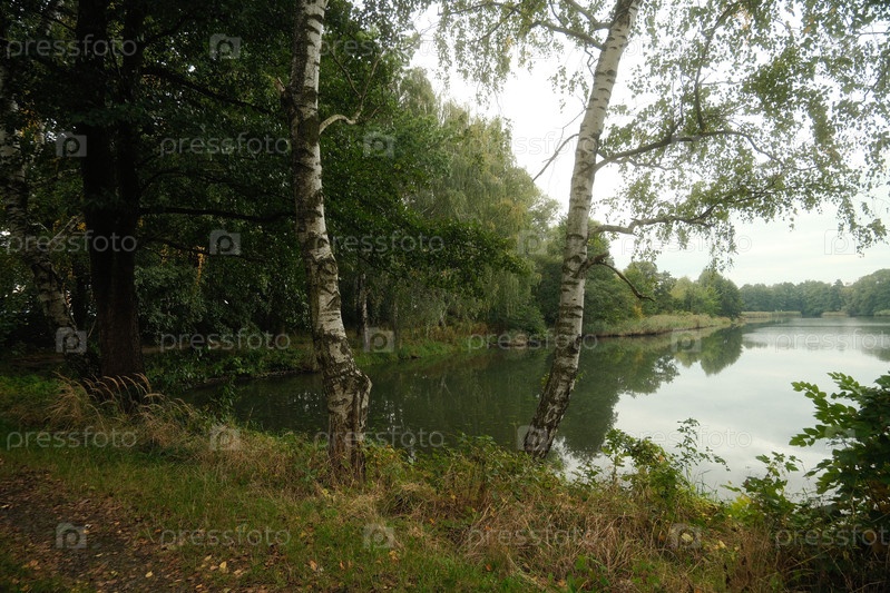 Спокойный край леса рядом с отражающим озером с утренней атмосферой