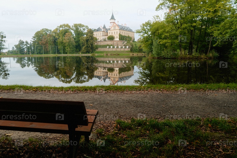 Спокойные воды зеркало Большое поместье среди осеннего листва и береговой линии