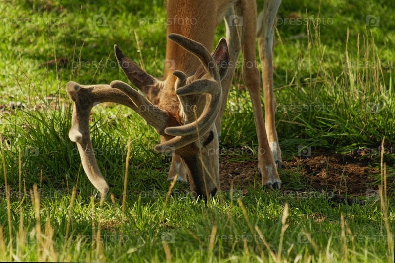Серьезный олень-муля пасется в пышном зеленом лесу