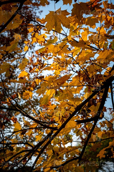 Слоистые золотые листья и переплетенные ветви создают эффектный осенний пейзаж в чешском парке