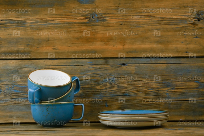 Куча голубых кружек в тарелках стоит на деревянном столе на сером фоне