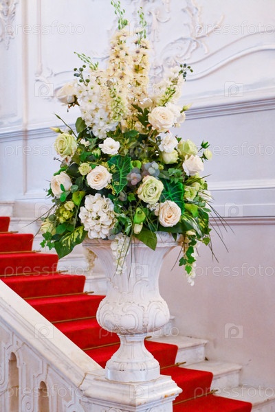 Натюрморт вазы с искусственными белыми цветами на ступеньках деревянной лестницы