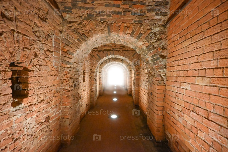 Заброшенный пустой старый темный подземный сводчатый погреб