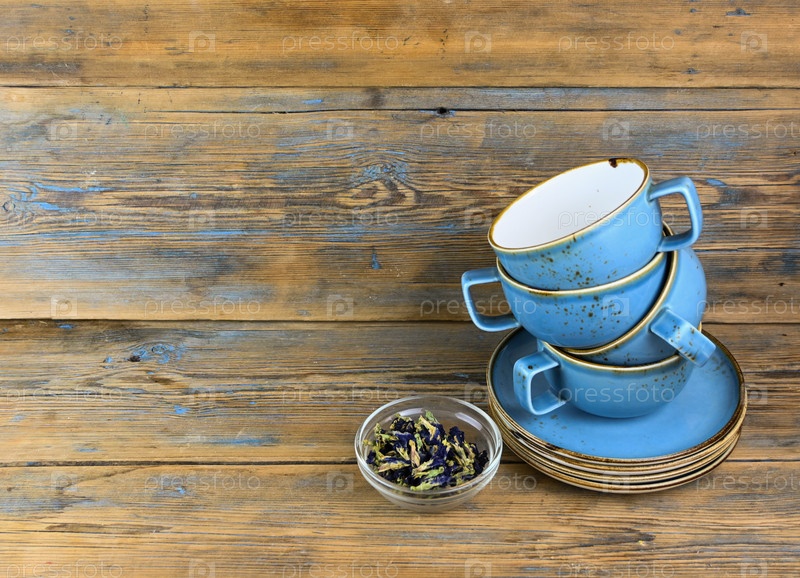 Куча голубых кружек в тарелках стоит на деревянном столе на сером фоне