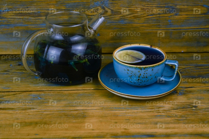 Освежающий синий чай в чашке и чайнике на сером деревянном столе на сером фоне