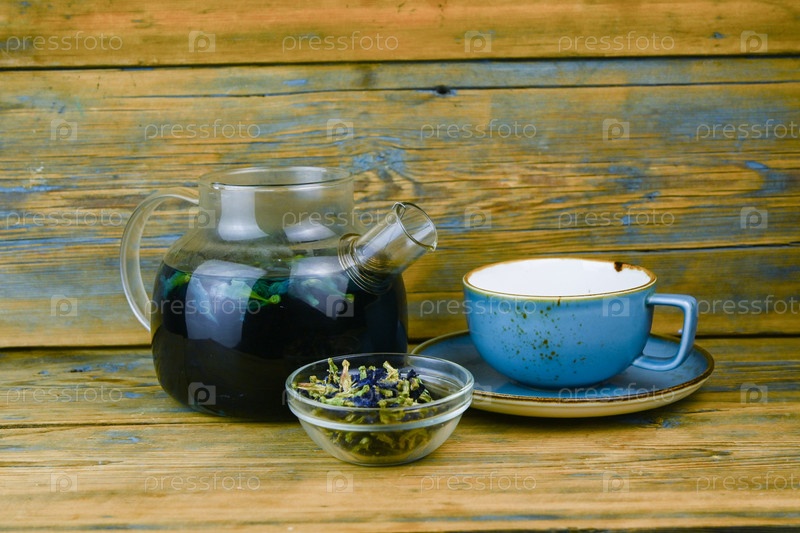 Освежающий синий чай в чашке и чайнике на сером деревянном столе на сером фоне