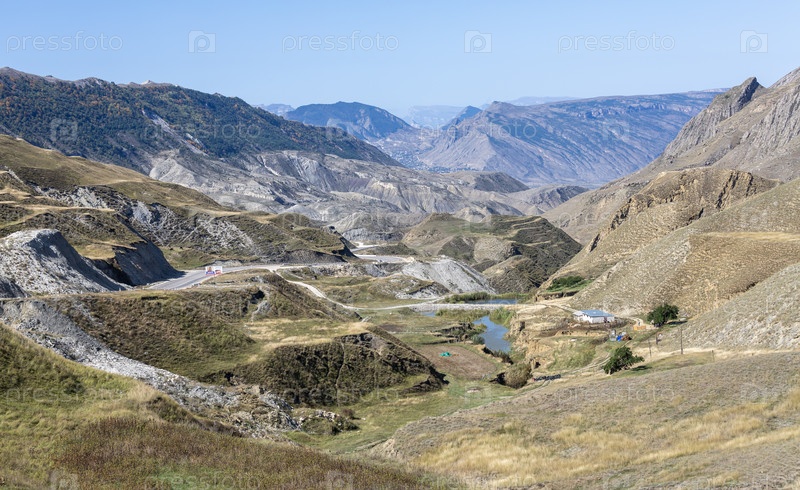 Панорамный вид осеннего пейзажа в горах Дагестана, республики на Северном Кавказе, Россия.Склоны покрыты выцветшей травой.Путешествие в высокогорье