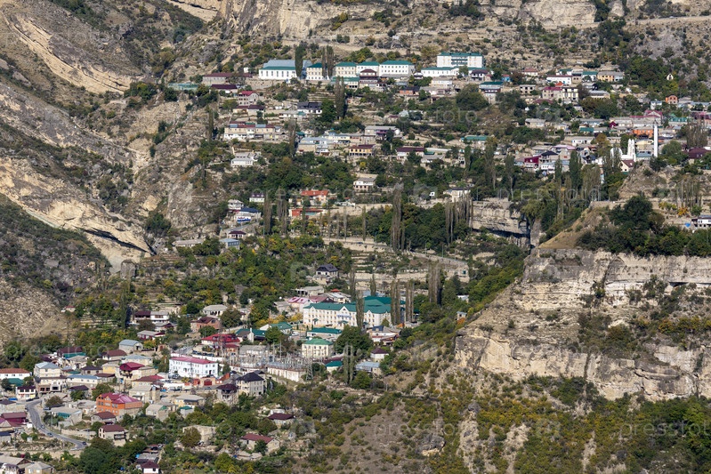 Вид сверху домов высокогорной деревни Гуниб на склоне горы