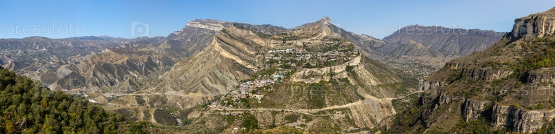 Панорамный вид на город Гуниб в Кавказских горах, Республика Дагестан.Высокогорная деревня на склонах горы Гуниб, окруженная хребтами.Осенний пейзаж в солнечный день